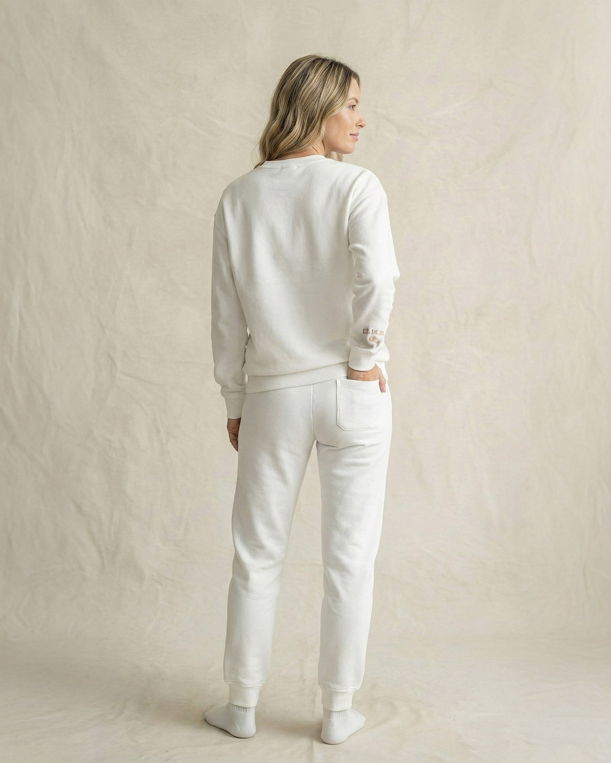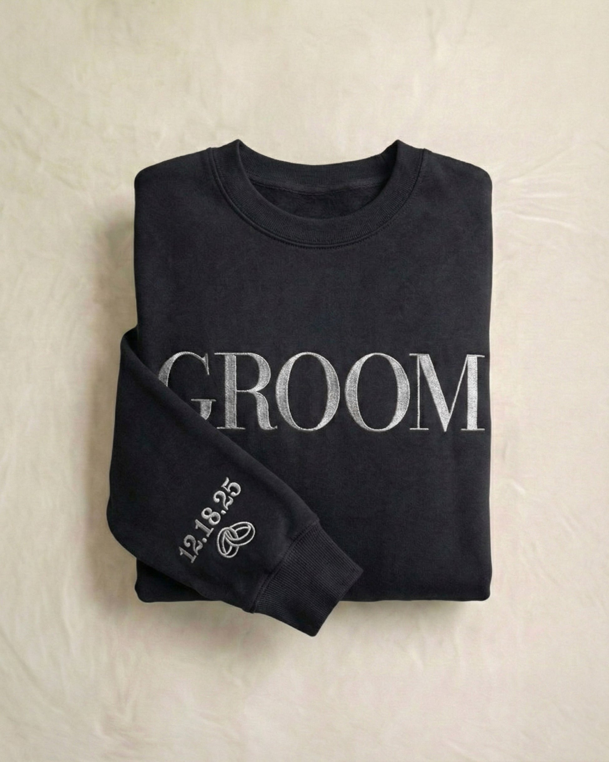 Crafted from our substantial cotton-faced fleece, every piece in this bundle offers a soft-washed, lived-in drape that feels instantly familiar. The detailing is executed with architectural precision: the chest feature our dense, dimensional fill stitch for a timeless look, while the sleeves are personalized with your shared date in a complementary satin stitch. A precision-crafted uniform for the days that matter most.