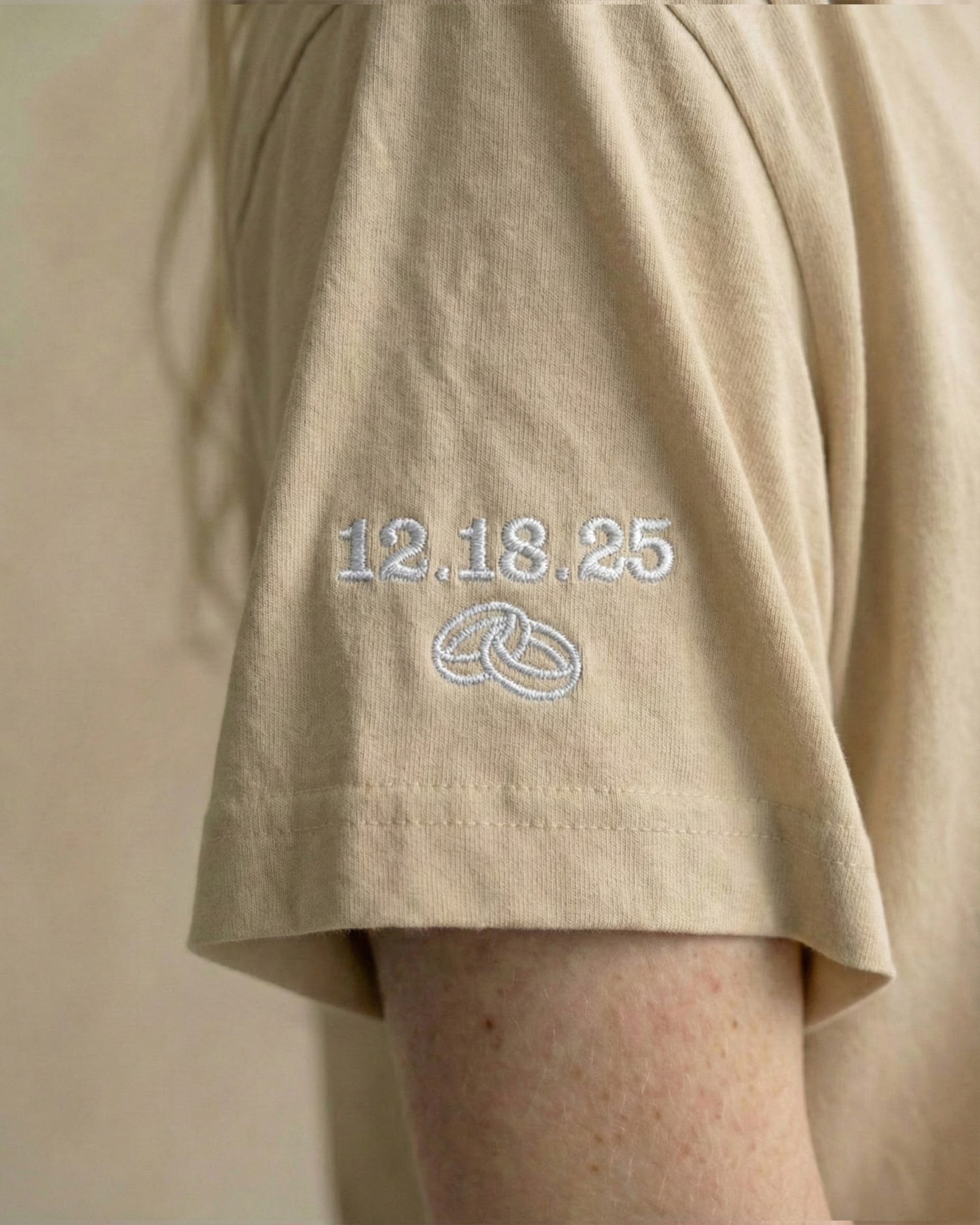 - The Personalization: Custom date and icon embroidered on both crewneck and tee sleeves.